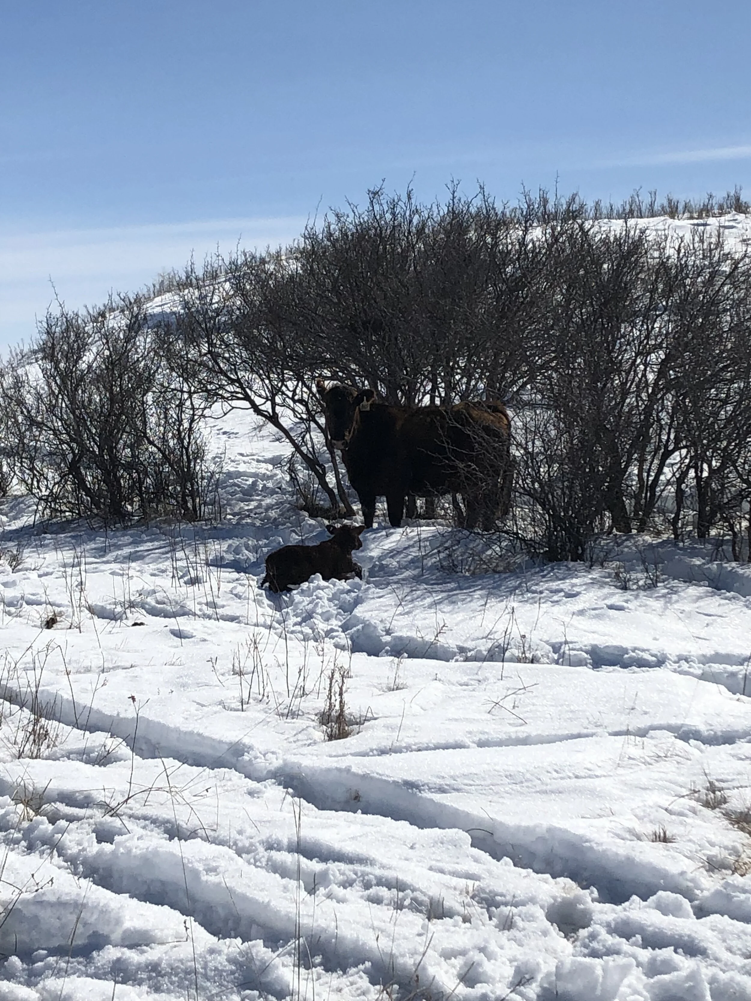 We noticed we were one short when we brought the cows home to the calving pasture the day before and sure enough here is a first calf heifer with her day old calf still down in the winter pasture.